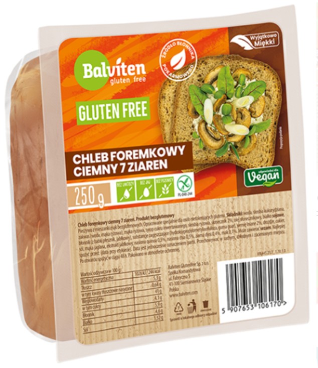 Ingredients: Water, corn starch, sourdough (water, rice flour), rice flour, invert sugar syrup, rice starch, sunflower seeds 2%, sunflower oil, SOY protein, fibre (psyllium, apple), thickeners (hydroxypropyl methylcellulose, guar gum), linseed 2%, yeast, sugar, salt, millet flour, apple extract, quinoa seeds 0.5%, chia - chia seeds (Salvia hispanica) 0.5%, pumpkin seeds 0.4%, poppy seeds 0.1%.