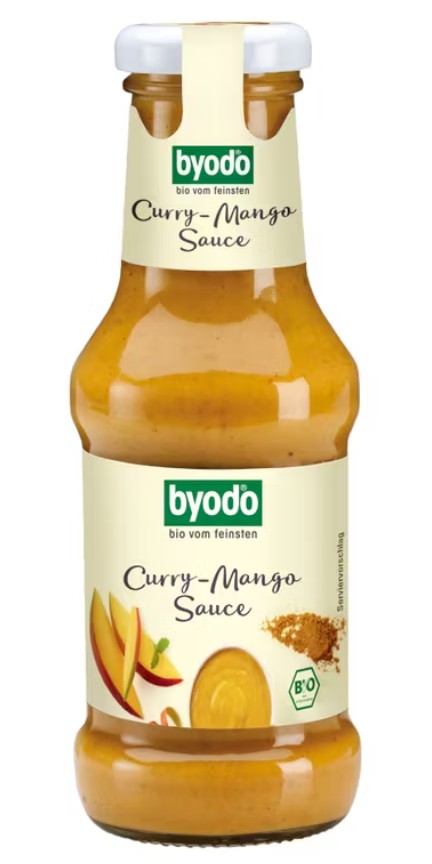Ingredients: Water, rapeseed oil*, raw cane sugar*, mango puree* (9.5%), apple vinegar*, corn starch*, curry* (1.9%) (contains MUSTARD), rock salt, tomato puree*, apricots*, onion*, red wine*, broad bean protein*, spices*, lemon juice concentrate*, rice protein*, thickener: guar gum*. (*certified organic ingredient)