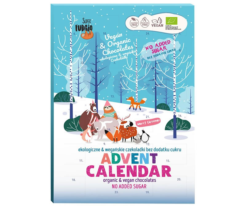 Advent calendar with vegan coconut chocolates. Source of dietary fibre. No added sugar. Contains naturally occurring sugars.