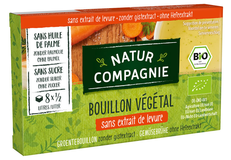 Ingredients: Sea salt, shea fat*, vegetables* (16.2%) (carrots* (4.8%), onion* (3.2%), parsnips*, leek*, tomatoes*, pumpkin*), corn starch*, concentrated vegetable juice* (carrots*, onion*), sunflower oil*, herbs* (lovage leaf*, bay leaf*), spices* (pepper*, turmeric*, lovage root*, nutmeg*, fennel seeds*), garlic*. (*certified organic ingredient)
