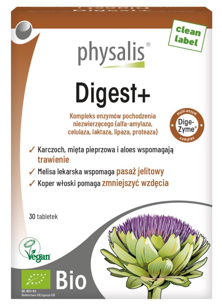 Too fast, too much, too fatty,... Do you have a bloated stomach after every meal? Physalis Digest+ organic is a complex of high-quality extracts from organically grown plants, such as artichoke, peppermint, and aloe vera (200:1 gel extract from leaves (aloin-free)), which support digestion and contribute to greater comfort after a (heavy) meal. Lemon balm supports intestinal transit, and fennel additionally helps combat bloating. Enriched with an enzyme complex (alpha-amylase, cellulase, lactase, lipase, protease) of non-animal origin!