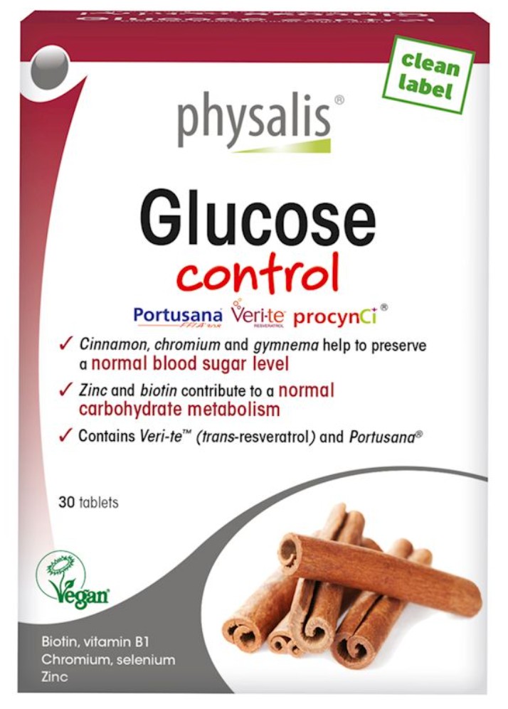 Physalis Glucose control is a synergistic complex containing both ProcynCi®, a natural cinnamon extract standardised at 40% polyphenols, and bioactive procyanidin type-A polymers. Like chromium and gymnema, cinnamon contributes to the preservation of a normal blood sugar level. Zinc and biotin contribute to a normal carbohydrate metabolism. Also contains Veri-te™, the 'gold standard' high-purity trans-resveratrol, produced by means of natural yeast fermentation. Supplemented with Portusana®, a highly concentrated and patented purslane extract.