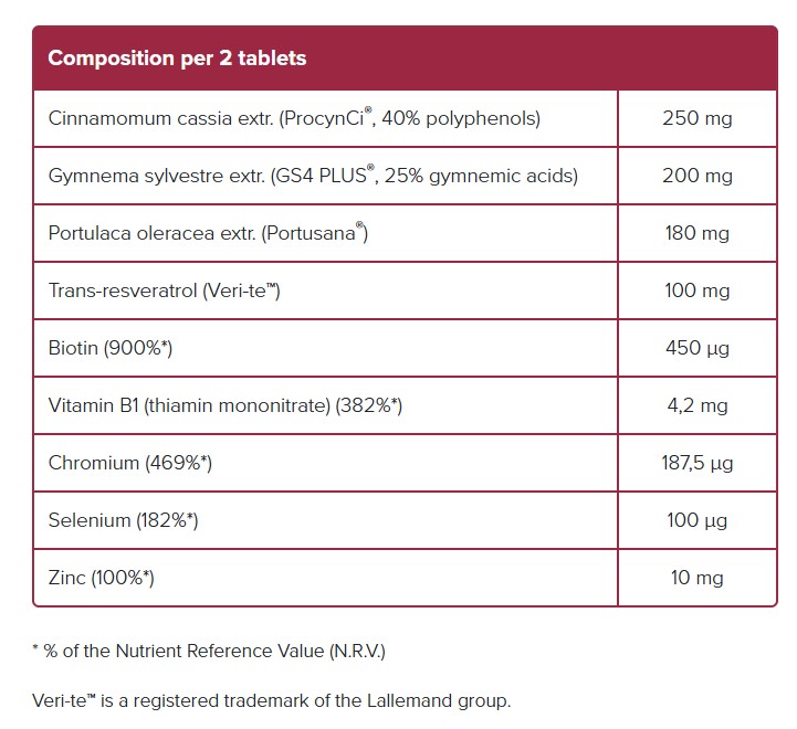 Ingredients: Bulking agent: cellulose, Chinese cinnamon extract (15%), gymnema extract (12%), purslane extract (11%), trans-resveratrol, glazing agent: fatty acids, zinc bisglycinate, anti-caking agents: calcium carbonate, tricalcium phosphate, L-selenomethionine, gelling agent: hydroxypropyl methylcellulose, thiamine mononitrate, chromium picolinate, emulsifier: glycerol, biotin.