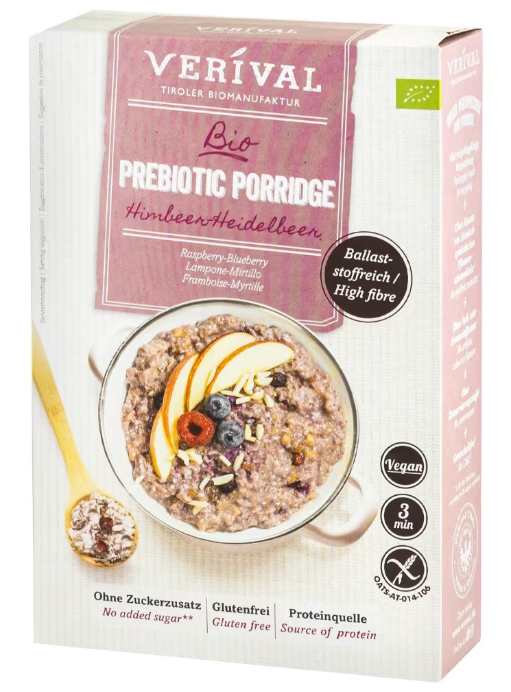 Ingredients: Сoarsely ground wholegrain gluten-free OAT flakes* 75.7%, apple cubes* 5%, chopped figs* (figs* 95%, rice flour*), inulin powder*, freeze-dried raspberry pieces* 2%, chia seeds* (Salvia hispanica), brown flaxseeds*, chopped ALMONDS*, psyllium husks*, Jerusalem artichoke granules*, freeze-dried blueberries* 1%, freeze-dried red currants*, beetroot powder*. (*certified organic ingredient).